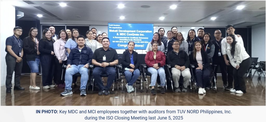 The audit, conducted by TÜV NORD Philippines, Inc. from June 2 to June 5, covered various project sites and confirmed that MDC and MCI’s integrated management system continues to meet the stringent requirements of these internationally recognized standards.